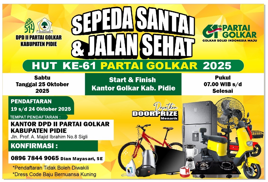 Pendaftaran untuk sepeda santai dan jalan sehat telah dibuka mulai 19 sampai 24 Oktober 2025 di Sekretariat DPD II Golkar Pidie, Jln. Prof. A. Majid Ibrahim No. 8 Sigli. Peserta dapat menghubungi Dian Mayasari, S.E. di nomor HP 0896 7844 9065 untuk konfirmasi pendaftaran.