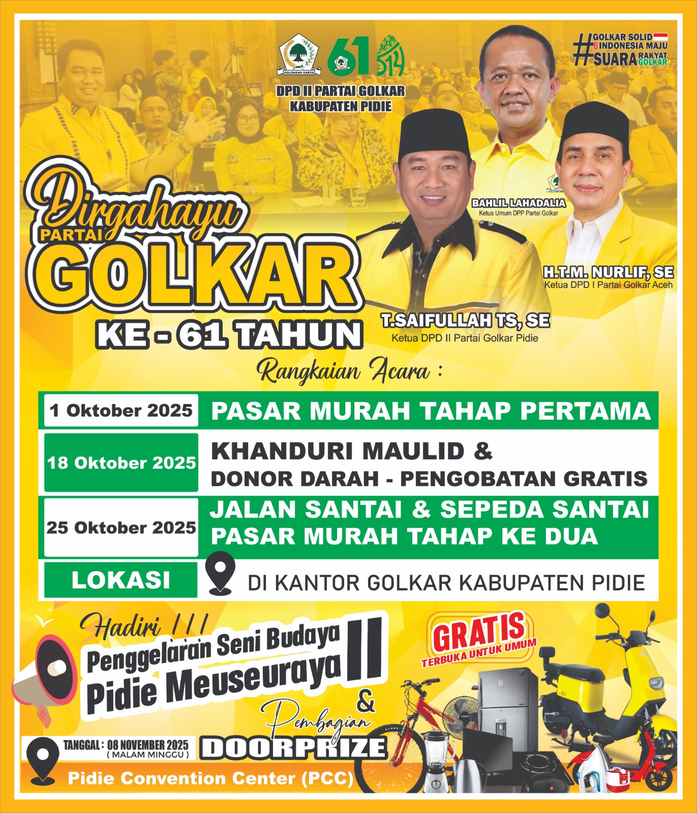 Sigli,haba RAKYAT I Partai Golkar Pidie kembali menunjukkan kepedulian dan komitmennya terhadap masyarakat dengan menggelar berbagai kegiatan dalam rangka memperingati Hari Ulang Tahun (HUT) ke-61 tahun 2025.