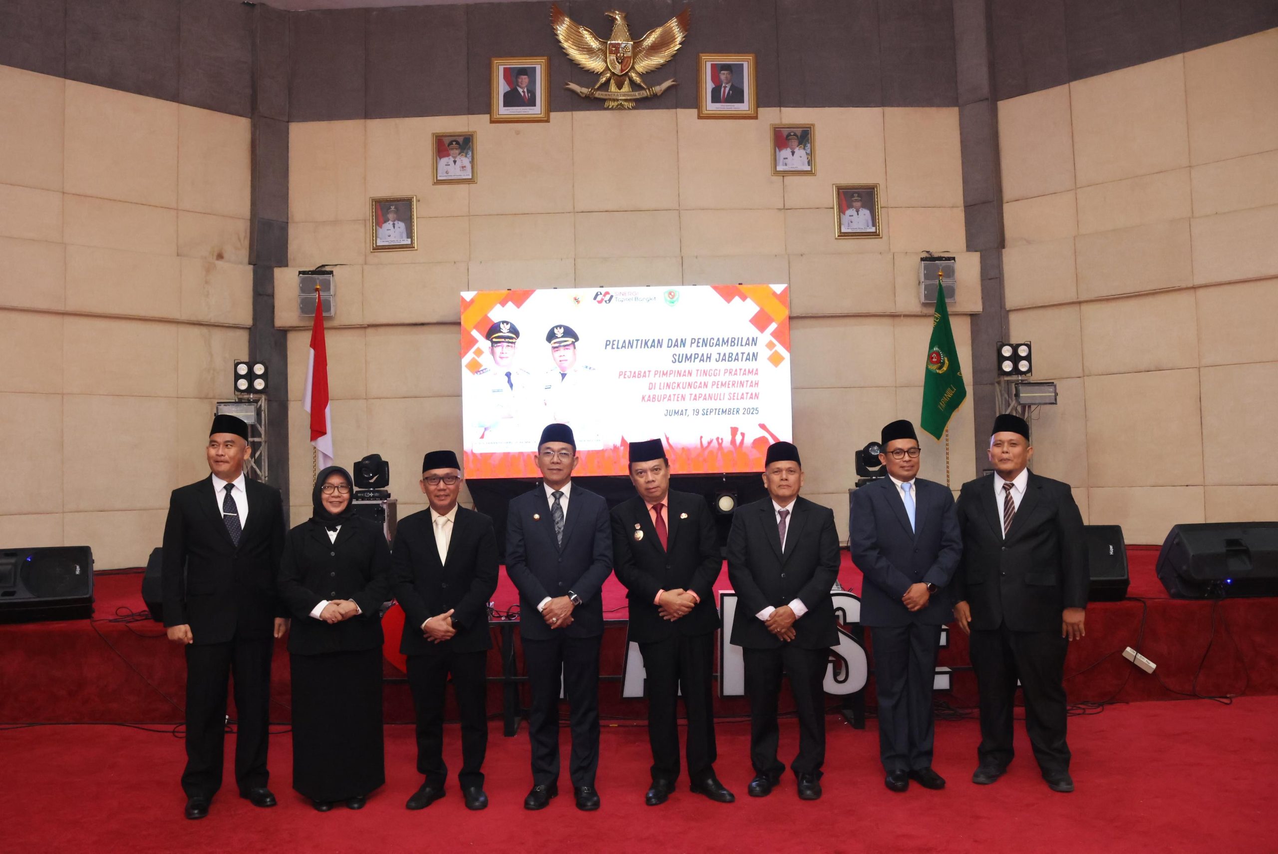 TAPANULI SELATAN –haba RAKYAT l Bupati Tapanuli Selatan (Tapsel) H. Gus Irawan Pasaribu secara resmi melantik dan mengambil sumpah dan janji lima pejabat Pimpinan Tinggi Pratama (Eselon II) di Gedung Serba Guna Sarasi, Komplek Perkantoran Pemerintah Tapsel, Jalan Prof. Lafran Pane, Sipirok, Jumat (19/9/2025).