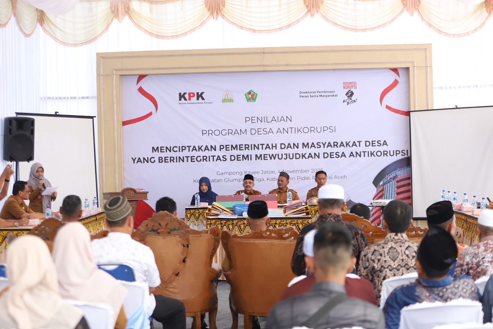 Sigli,haba RAKYAT I Bupati Pidie, H. Sarjani Abdullah, S.H., M.H., didampingi Asisten I, Dr. H. Nadhar Putra, M.Si., secara resmi membuka Penilaian Program Desa Antikorupsi Tahun 2025, di Gampong Kayee Jatoe, Kecamatan Glumpang Tiga, Selasa (04/10/2025).