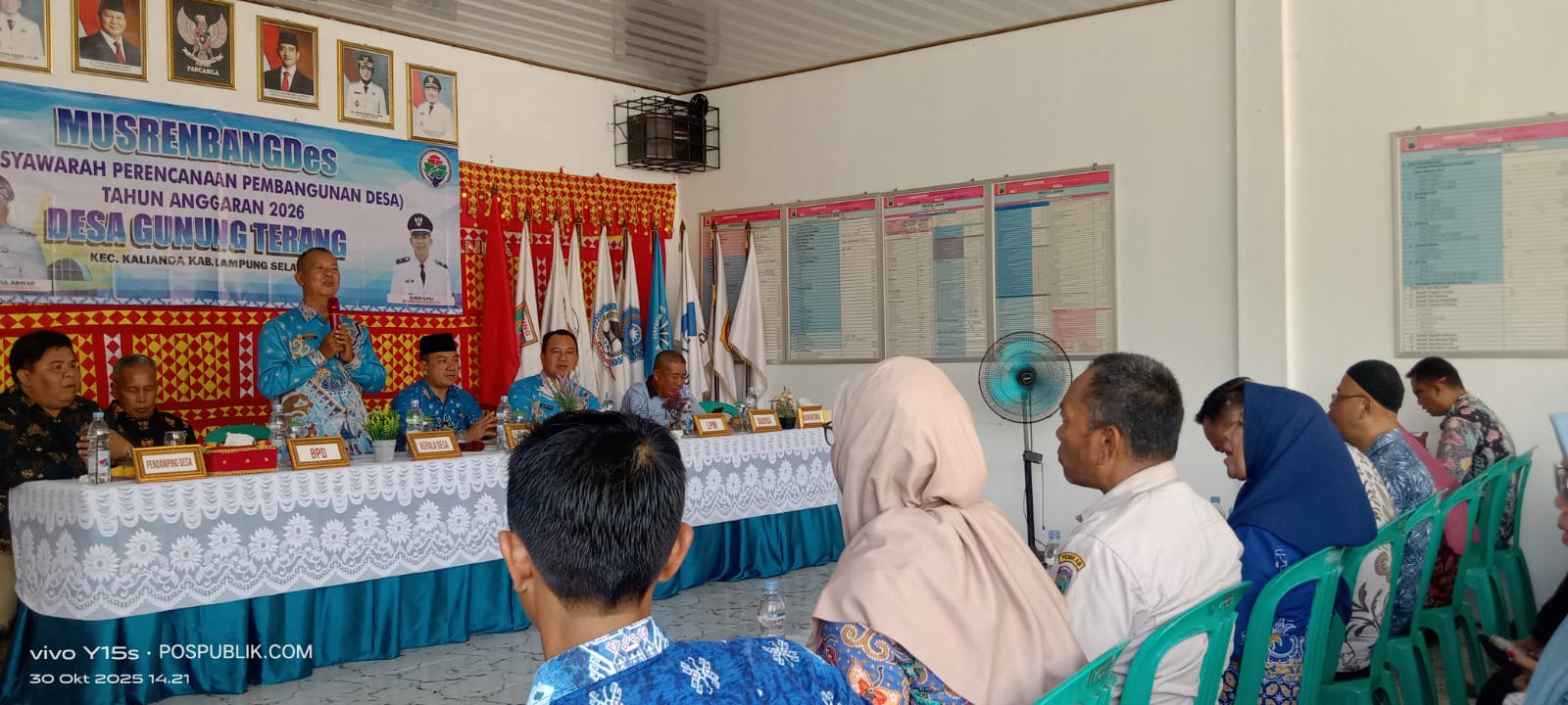 LAMPUNG SELATAN – haba RAKYAT | Ketukan mikrofon menandai dibukanya secara resmi kegiatan Musyawarah Perencanaan Pembangunan Desa (MusrenbangDes) Desa Gunung Terang, Kecamatan Kalianda, Kabupaten Lampung Selatan, Tahun Anggaran 2026. Kegiatan tersebut berlangsung di aula kantor desa setempat, Kamis (30/10/2025).