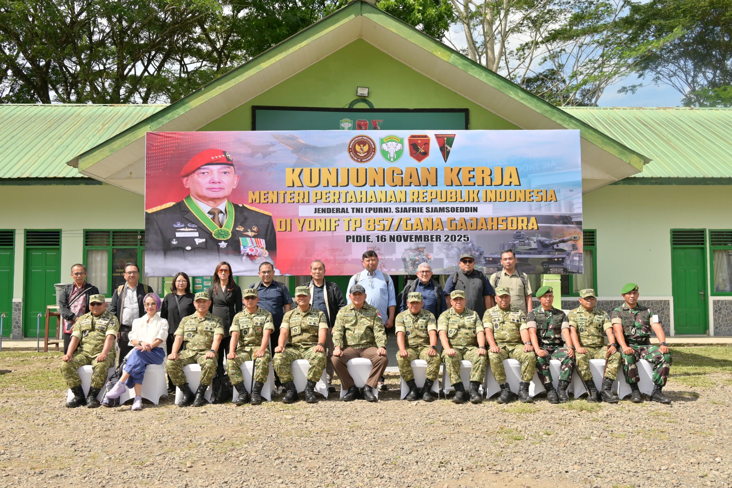 Sigli,haba RAKYAT I Komandan Kodim 0102/Pidie, Letkol Inf Andi Irsan, M.Han, turut mendampingi Kasdam Iskandar Muda (IM) Brigjen TNI Yudha Fitri, Kapoksahli Pangdam IM Brigjen TNI Bambang Sulistyo Heri, S.Sos., M.Han, serta Danrem 011/Lilawangsa Kolonel Inf Ali Imran dalam penyambutan kunjungan kerja Menteri Pertahanan RI, Jenderal TNI (Hor) Purn. Sjafrie Sjamsoeddin, di Batalyon Infanteri Teritorial Pembangunan (Yonif TP) 857/Gana Gajahsora, Kecamatan Mane, Kabupaten Pidie, Minggu (16/11/2025).