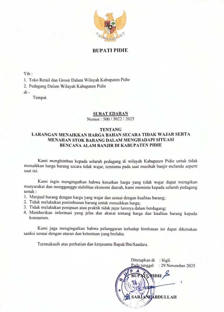 Penegasan ini sesuai Surat Edaran Bupati Pidie, Nomor: 500/5022/2025 tentang larangan menaikkan harga barang secara tidak wajar serta menahan stok barang dalam menghadapi situasi bencana alam banjir di Kabupaten Pidie.