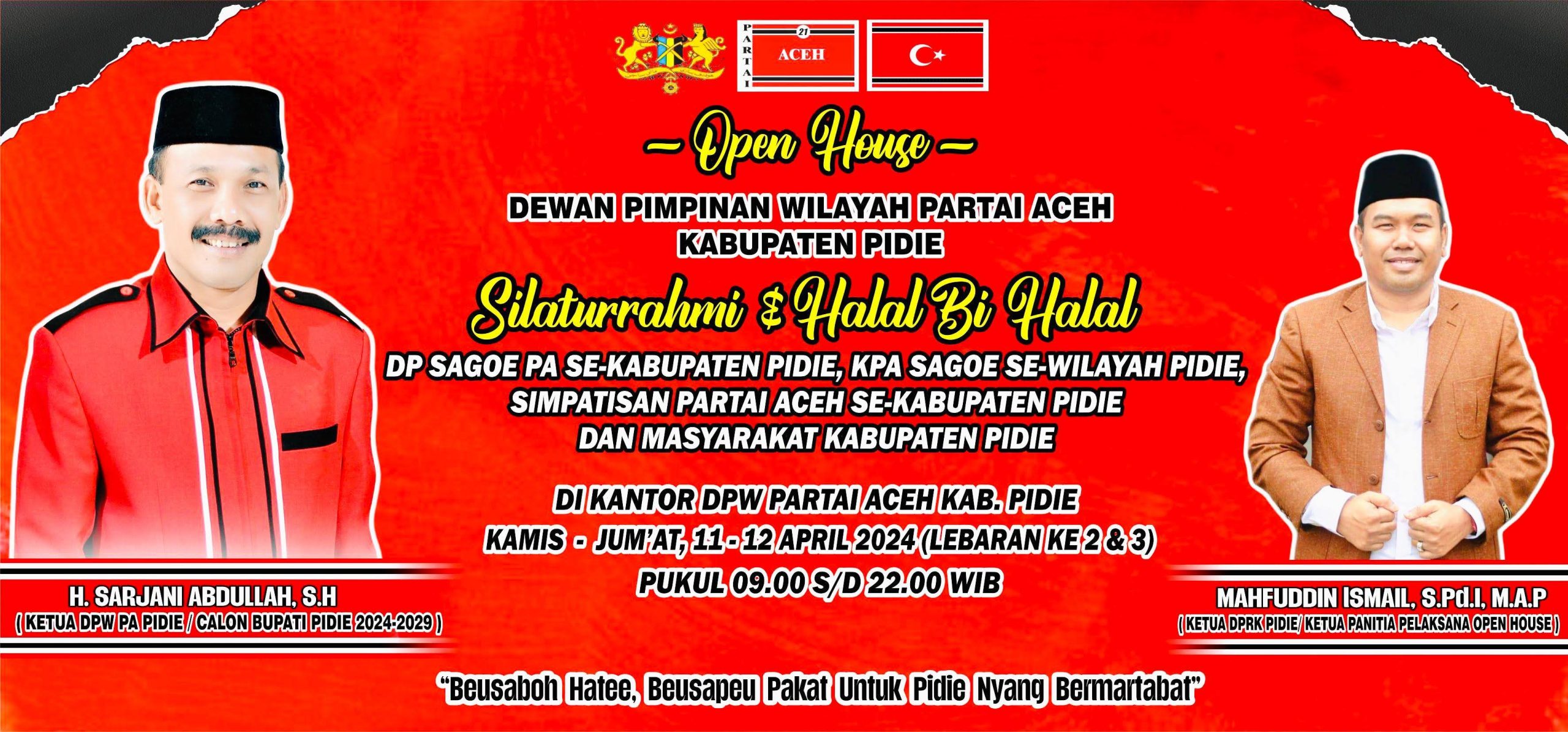 Dewan Pimpinan Wilayah Partai Aceh (DPW-PA) Kabupaten Pidie kembali menggelar Open House (Pintu Terbuka/Terima Tamu) lebaran Idul Fitri 1445 H/2024 M bagi Pengurus Partai, Anggota KPA, Kader, Simpatisan dan Masyarakat Umum lainnya.