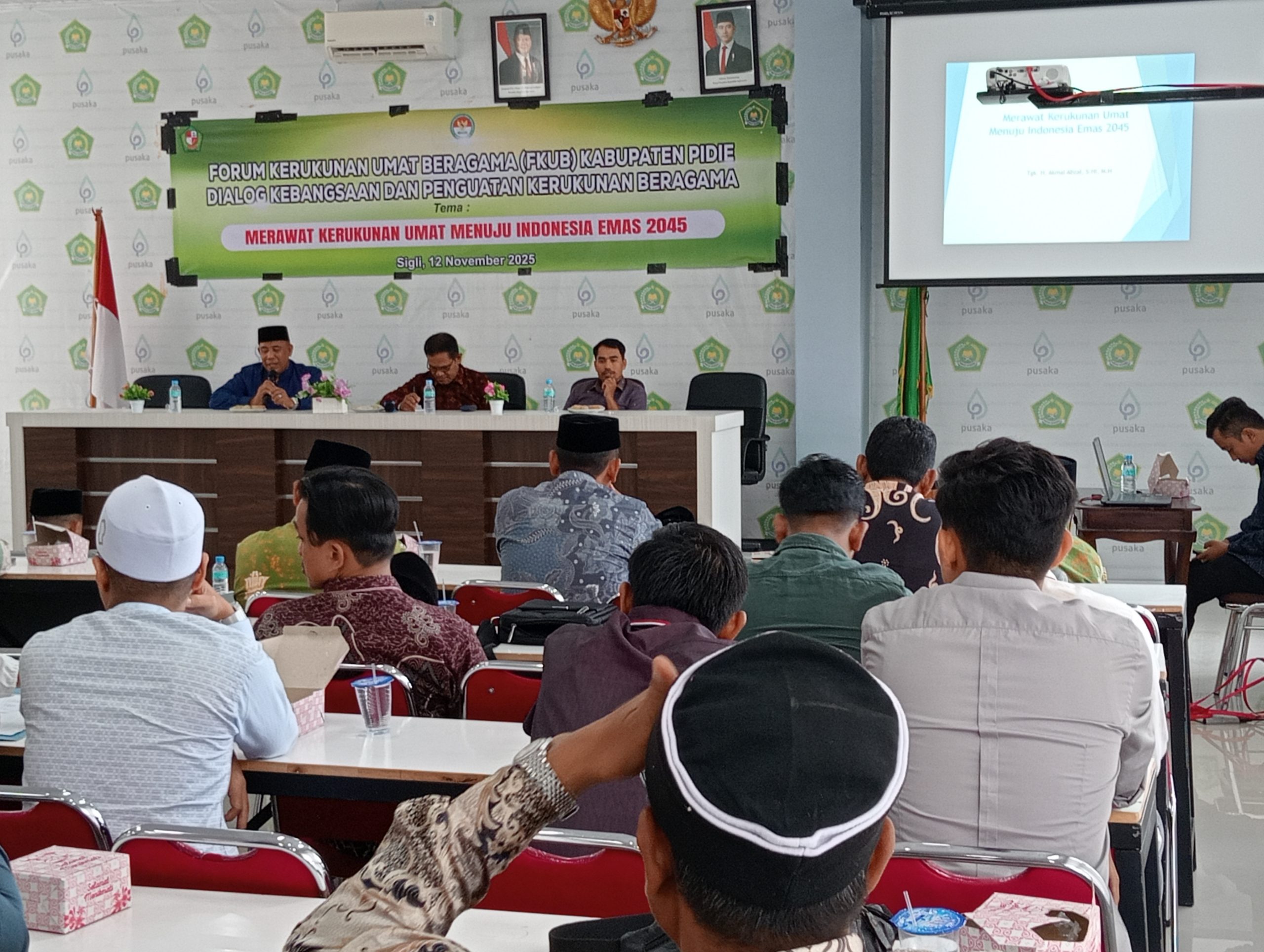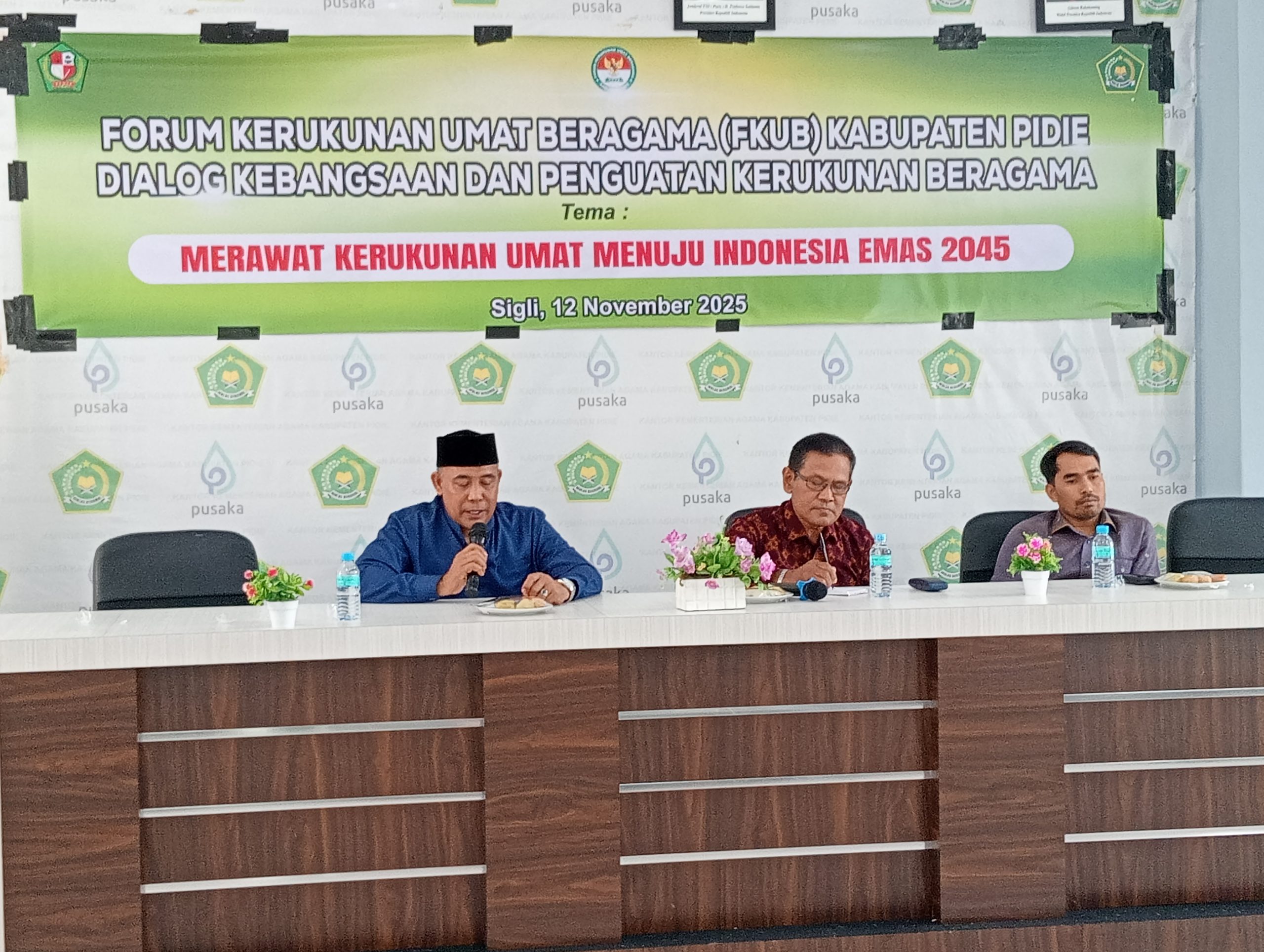 Dialog yang bertemakan “Merawat Kerukunan Umat Menuju Indonesia Emas 2045” ini berlangsung di Aula PLHUT Kantor Kemenag Pidie, Rabu (12/11/2025), dan dihadiri oleh Pejabat Badan Kesbangpol, Kantor Kemenag, penasehat, pengurus, dan anggota FKUB Pidie.
