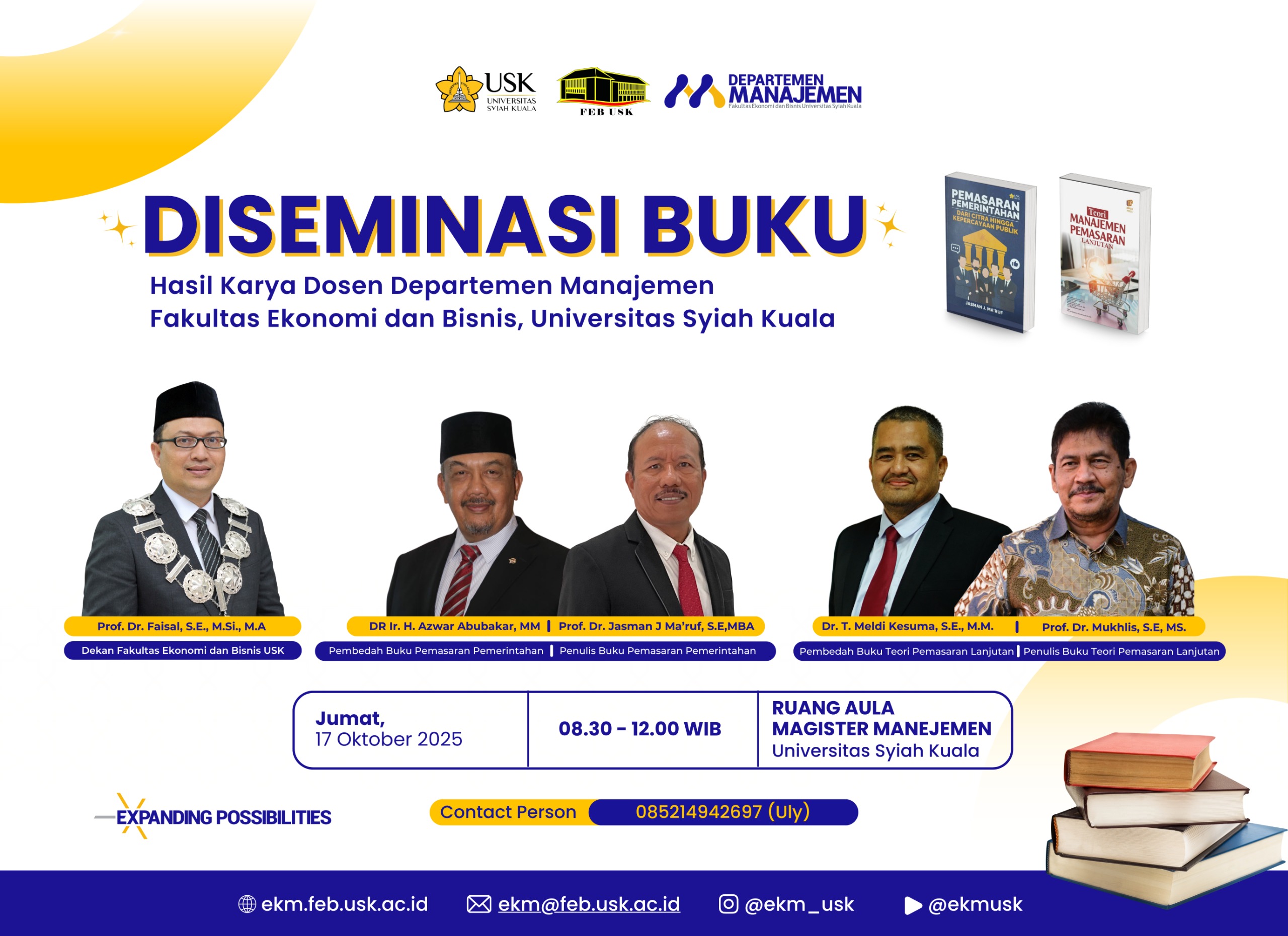 Sigli,haba RAKYAT I Buku “Teori Manajemen Pemasaran Lanjutan” karya Prof. Dr. Mukhlis Yunus, S.E., M.S., bersama para pakar pemasaran akan dibedah pada Jum’at 17 Oktober 2025, pukul 08.30-12.00 Wib, di Ruang Diklat Fakultas Ekonomi dan Bisnis (FEB) Universitas Syiah Kuala (USK) Banda Aceh, oleh Dr. T. Meldi Kesuma, S.E., M.M. (Sekretaris USK).