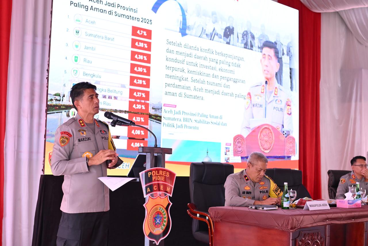 “Aceh harus jadi tempat yang aman dan nyaman bagi semua orang. Dari 10 provinsi di Sumatra, Aceh menjadi yang paling kondusif, dan ini merupakan hasil kerja bersama seluruh elemen masyarakat serta aparat keamanan,” kata Irjen Pol. Marzuki Ali Basyah saat melaksanakan kunjungan kerja (Kunker) di Polres Pidie, Kamis (20/11/2025).