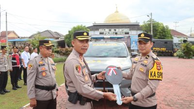 Kapolres Muba AKBP God Parlasro Sinaga, S.H., S.I.K., M.H. saat menyerahkan secara langsung Satu unit kendaraan dinas operasional kepada Pamapta Polres Muba. Foto : Sherly Pradia/haba RAKYAT.