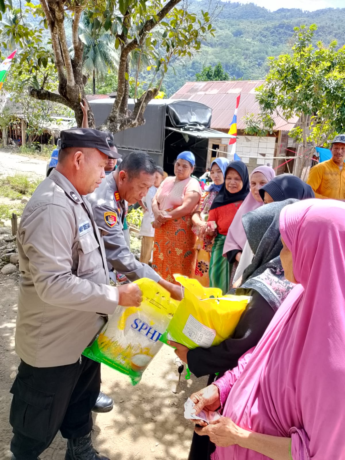 Kapolsek Sosopan AKP Irmanto bersama anggotanya, saat membagikan beras murah SPHB kepada warga desa Pagaran Bira, Kecamatan Sosopan Kabupaten Padang Lawas – Sumut. Foto: Kaya Nasution/haba RAKYAT.