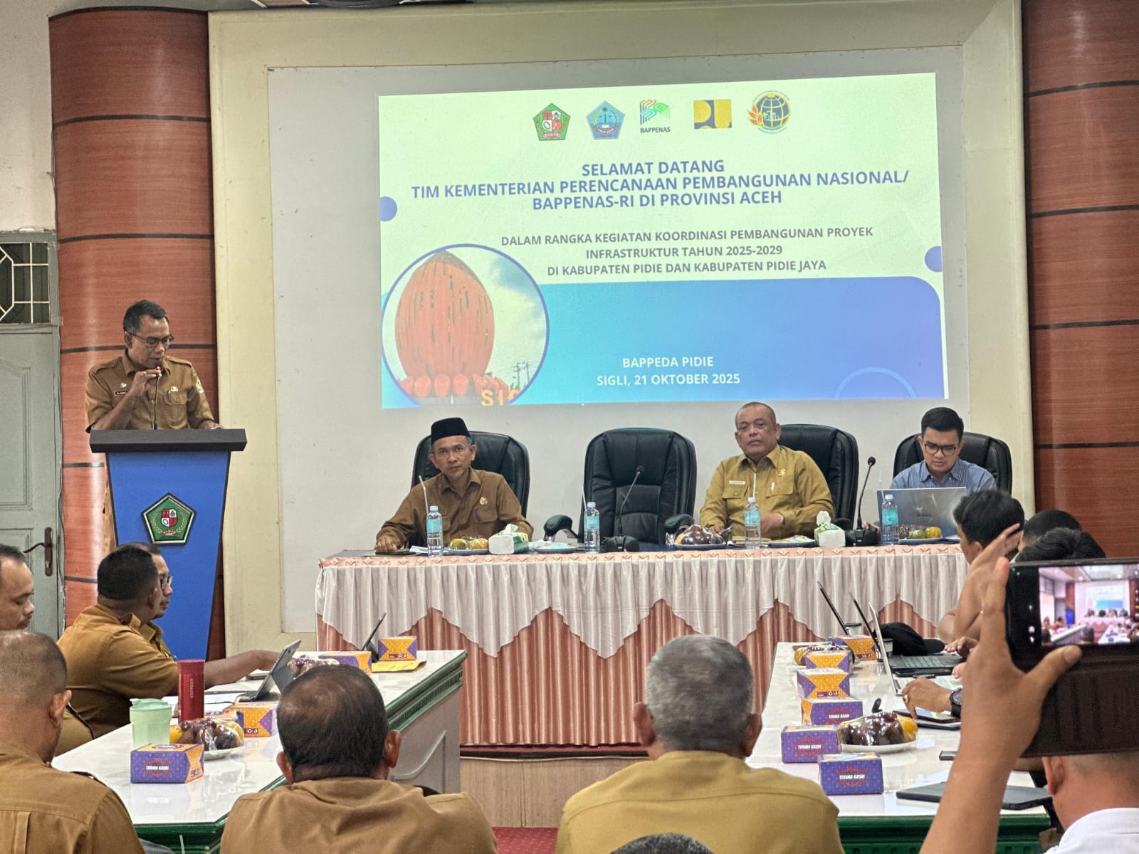 Sigli,haba RAKYAT I Bahas pembangunan proyek infrastruktur, Tim dari Kementerian Perencanaan Pembangunan Nasional (PPN)/BAPPENAS, gelar Rapat Koordinasi (Rakor) bersama Pemkab Pidie dan Pidie Jaya (Pijay), bertempat di Aula BAPPEDA Pidie, Selasa (21/10/2025).