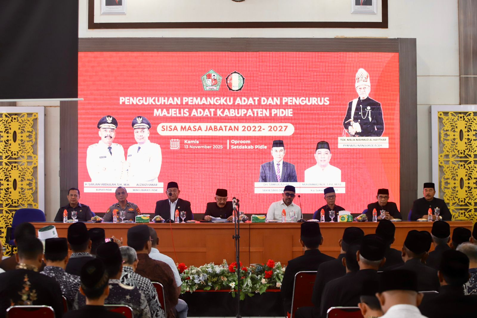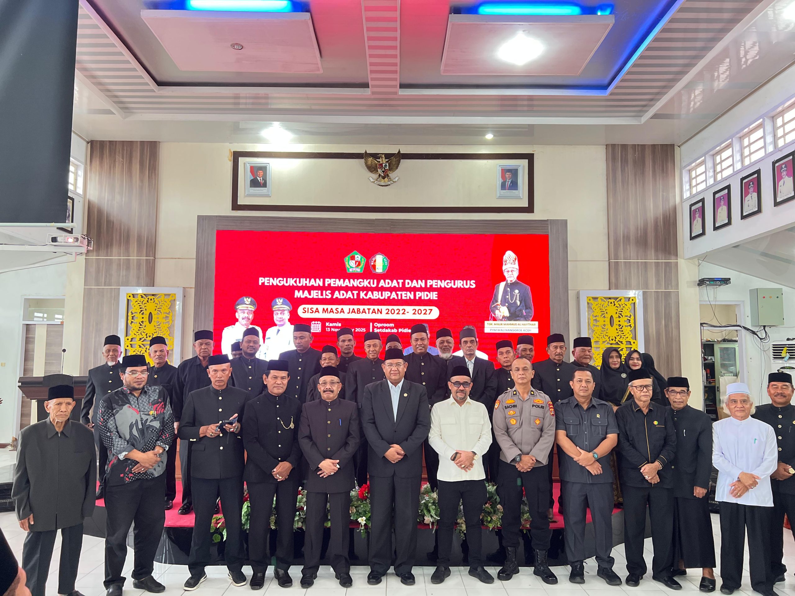 Sigli,haba RAKYAT I Bupati H. Sarjani Abdullah, S.H., M.H., mengukuhkan Pemangku Adat dan Pengurus Majelis Adat Aceh (MAA) Kabupaten Pidie Sisa Masa Jabatan 2022-2027, bertempat di Oproom Setdakab setempat, Kamis (13/11/2025).