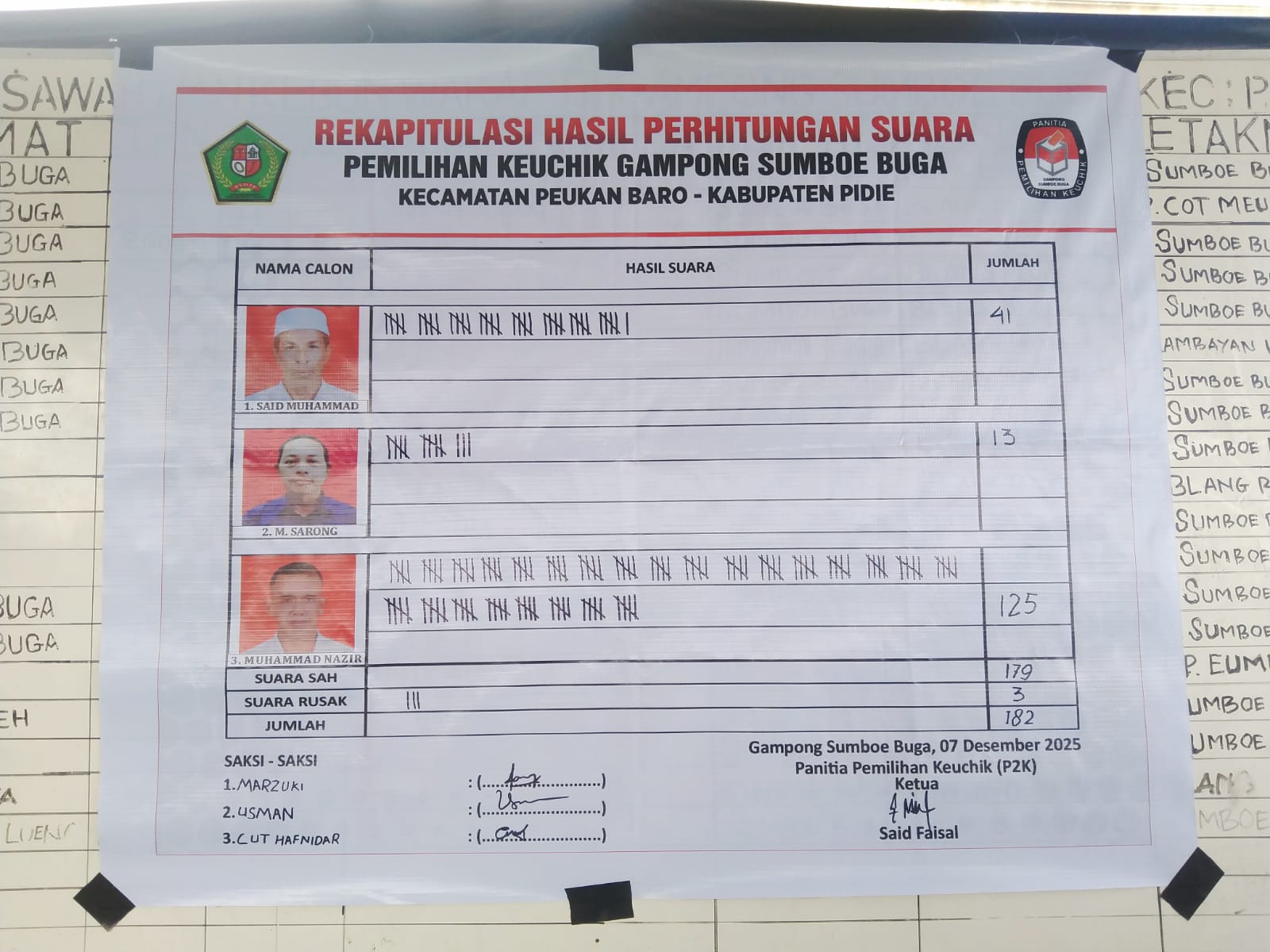 Berdasarkan hasil perhitungan suara yang dilakukan oleh P2K pada pemilihan Keuchik Gampong Sumboe Buga, sebagai berikut: