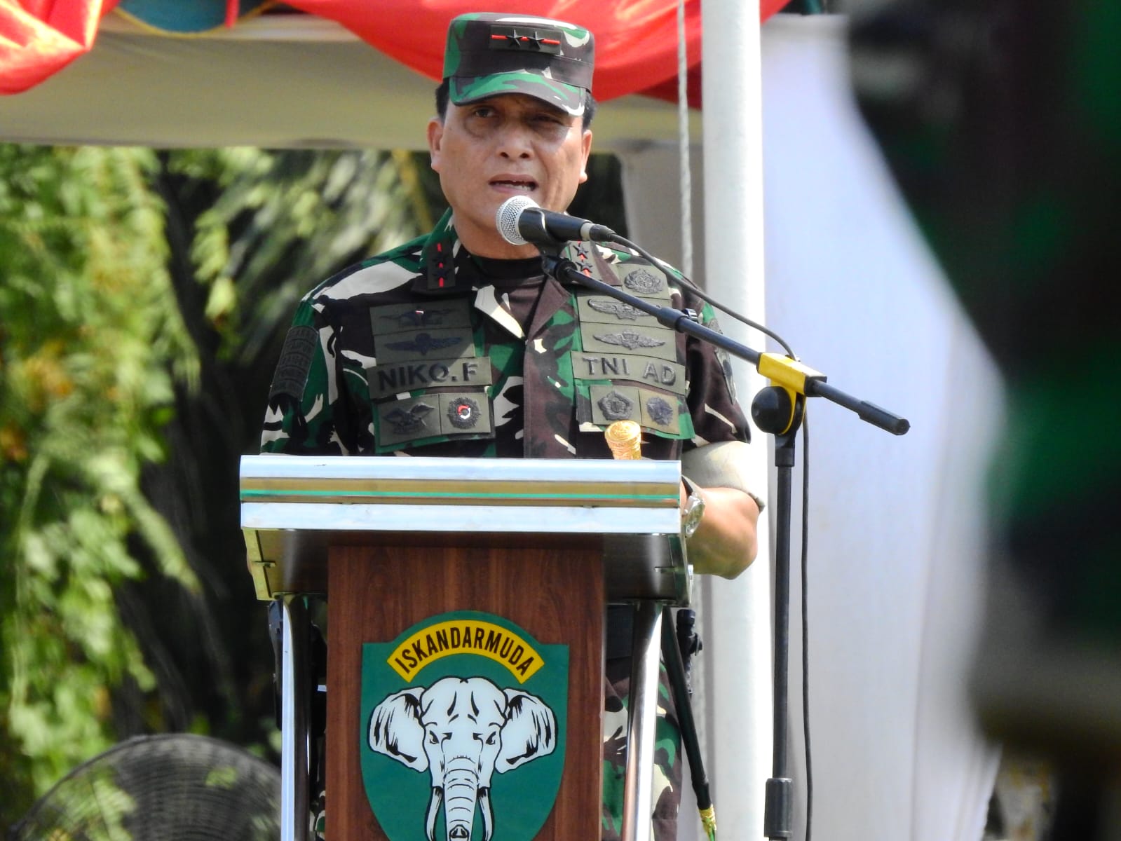Pangdam Iskandar Muda, Mayjen TNI Niko Fahrizal, M.Tr, (Han) saat menyampaikan sambutan pada penutupan kegiatan TMMD ke-119 tahun 2024 Kodim 0117/Aceh Tamiang. (Foto/ hR/ Muharram Syafri)
