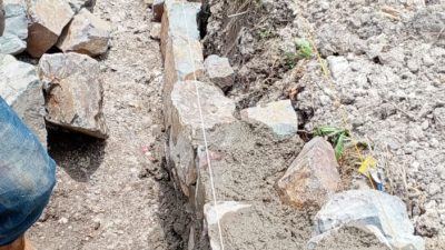 Namun, hasil pengecekan di lapangan menunjukkan pondasi hanya digali sekitar 20 cm, batu yang digunakan merupakan batu lapis, dan adukan semen dibuat secara manual tanpa molen maupun ukuran komposisi yang jelas.