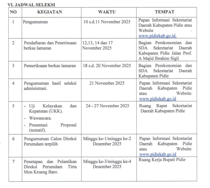 Sigli,haba RAKYAT I Proses seleksi pemilihan Direksi Perumdam Tirta Mon Krueng Baro Kabupaten Pidie untuk masa jabatan 2025 sampai 2030, terus berjalan sesuai jadwal yang telah ditetapkan oleh Panitia Seleksi (Pansel). Dan untuk tahap ini, tiga calon telah dinyatakan lolos seleksi administrasi.