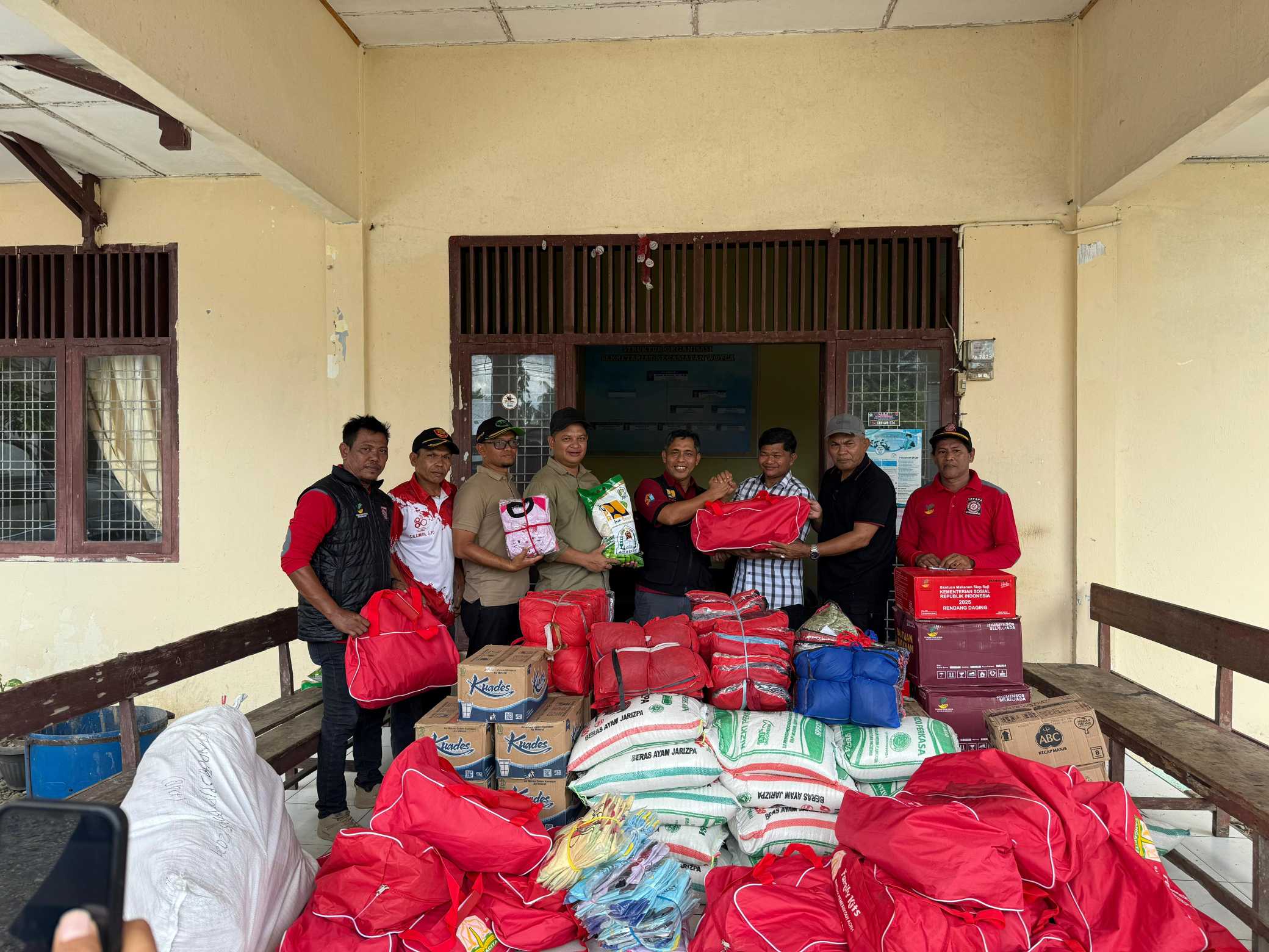 Plt Sekretaris Daerah, Dr. Kurdi, bersama Asisten Pemerintahan dan Keistimewaan Aceh Setdakab Aceh Barat, Ifan Murdani, serta Kepala Dinas Sosial, Mulyadi, dan Tim RAPI, saat langsung menyerahkan bantuan darurat di Sekretariat Kecamatan Woyla, Woyla Timur dan Kaway XVI, Aceh Barat, Meulaboh. Foto : Mardianto/haba RAKYAT.