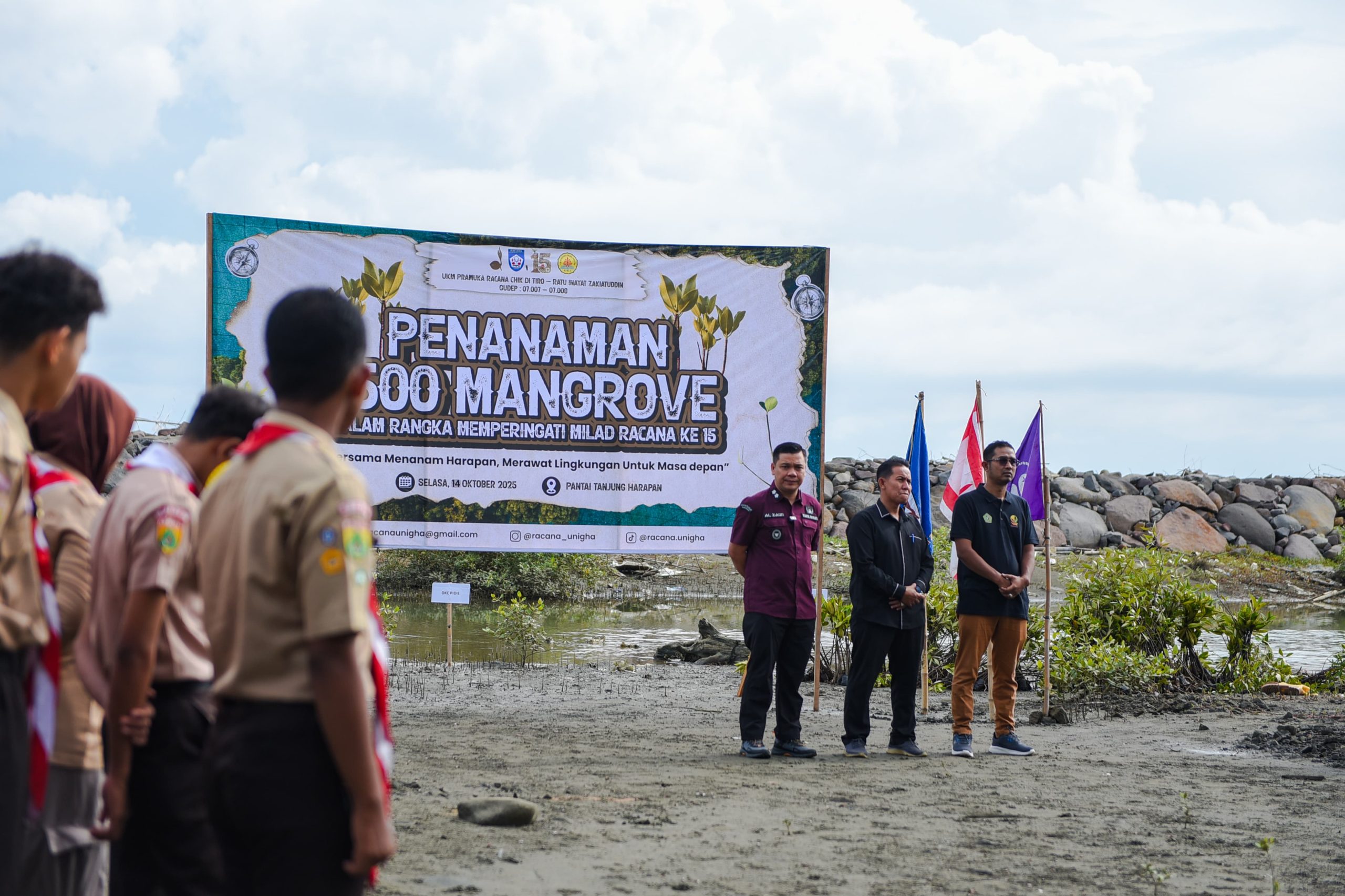 Sigli,haba RAKYAT I Dalam rangka memperingati Milad ke-15 Racana Chik Ditiro Universitas Jabal Ghafur (Unigha) Sigli, Wakil Bupati Pidie Alzaizi ikut bersama menanam 1.500 bibit mangrove di Pantai Tanjong Harapan, Sigli, Selasa (14/10/2025).