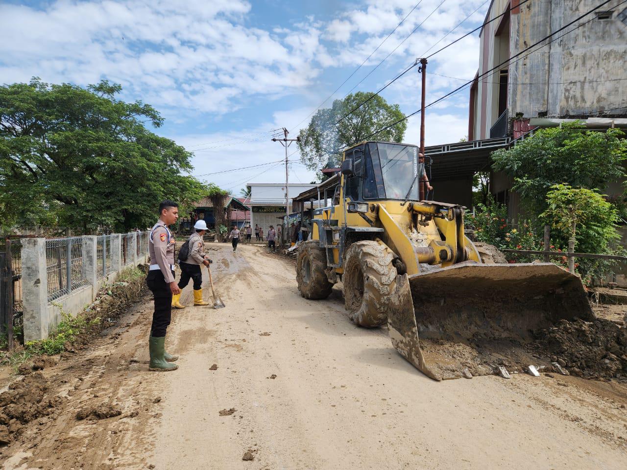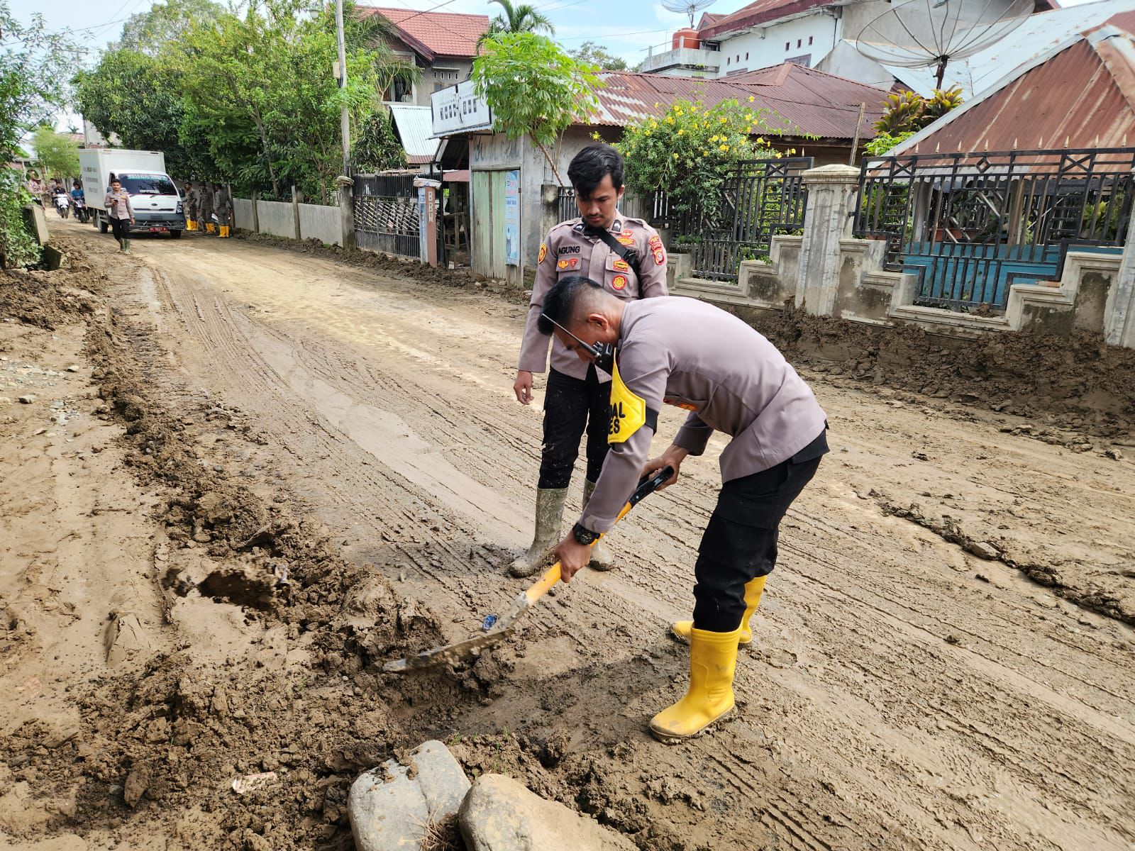 Dalam kegiatan ini, Polres Pidie menurunkan personel yang dibekali peralatan manual seperti cangkul dan sekop untuk membersihkan lumpur serta material yang menutupi jalan maupun saluran air di sepanjang ruas tersebut.