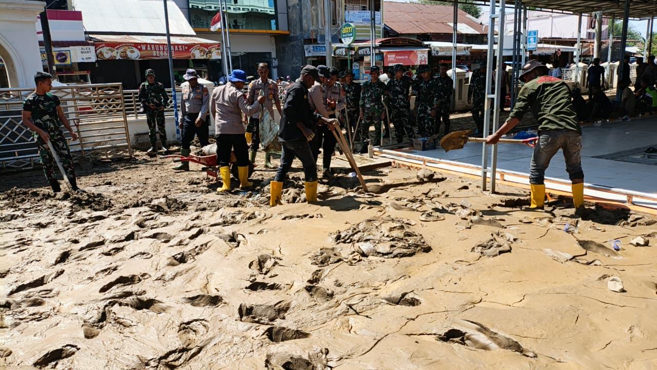 Dengan menggunakan sekop dan cangkul, Personel Polri dan TNI, bersama warga setempat terlihat aktif melakukan pembersihan, sehingga proses gotong royong berlangsung cepat dan efektif.