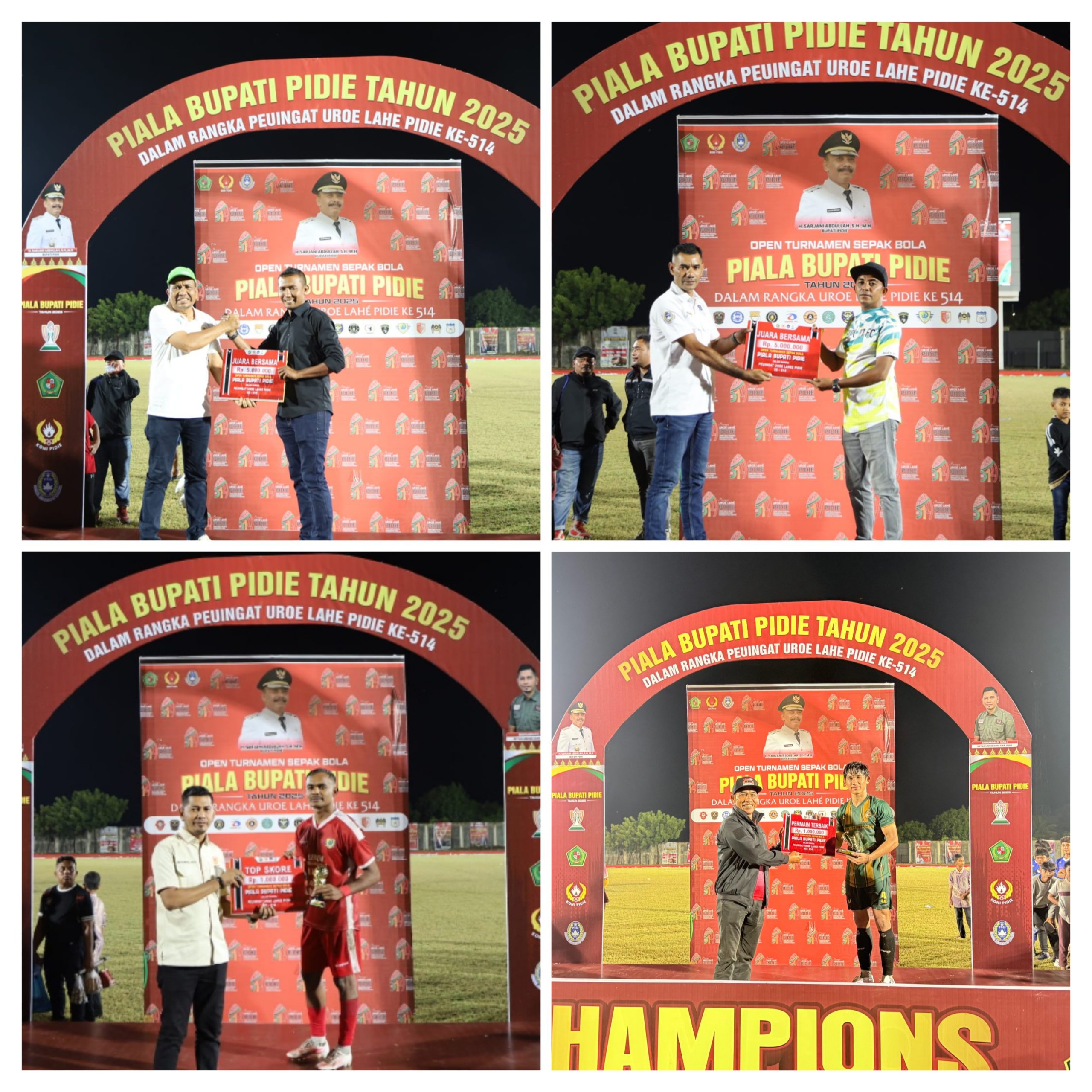 Kemudian penghargaan untuk pemain terbaik diserahkan oleh Kabag Ops Polres Pidie, AKP Raja Aminuddin Harahap, dan Top Skor oleh Ketua KONI Pidie, Muhammad. Ketua Panpel Syukri AG, R, ikut mendampingi momen tersebut.