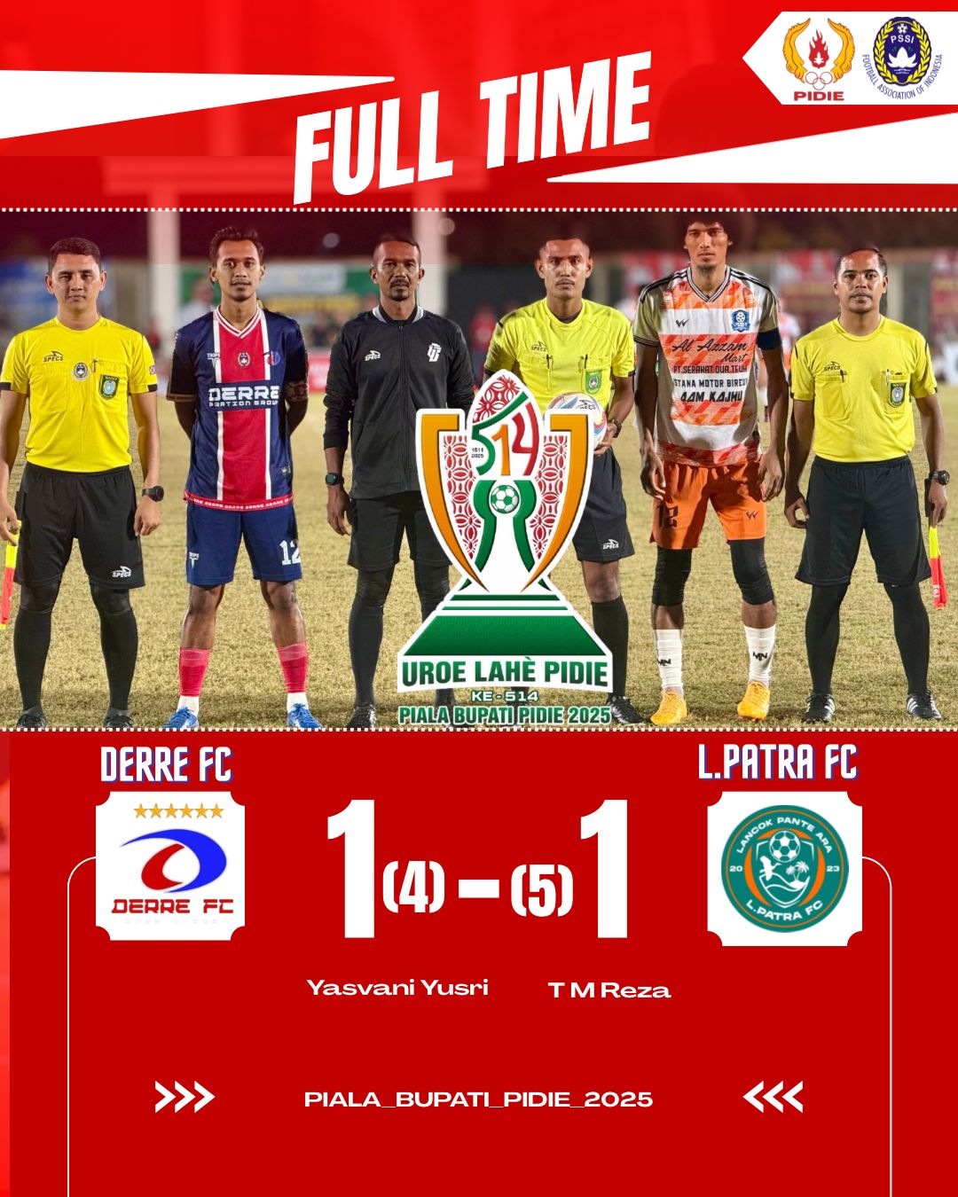 L. Patra FC berhasil memenangkan adu penalti dengan skor 5-4 dan melaju ke babak selanjutnya. Dengan hasil ini, L. Patra Bireuen membuktikan diri sebagai tim yang tangguh dan patut diperhitungkan dalam turnamen Piala Bupati Hajad ke-514 Pidie ini.