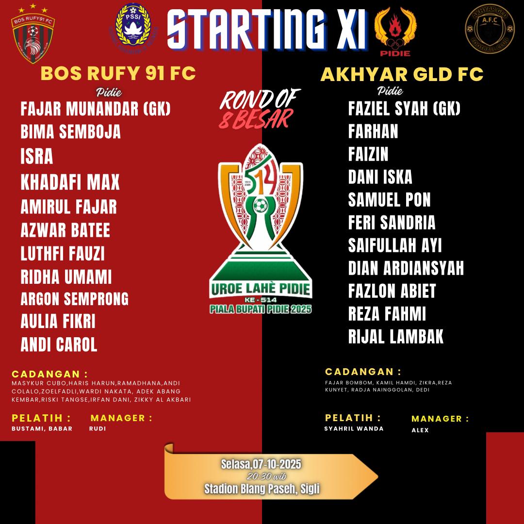 Pertandingan selanjutnya akan mempertemukan Akhyar GLD Padang Tiji dengan Bos Rufy 91 FC Lampoh Krueng Sigli pada Selasa (7/10/2025) malam. Saksikan aksi seru para pemain sepak bola terbaik di Kabupaten Pidie.(AA)
