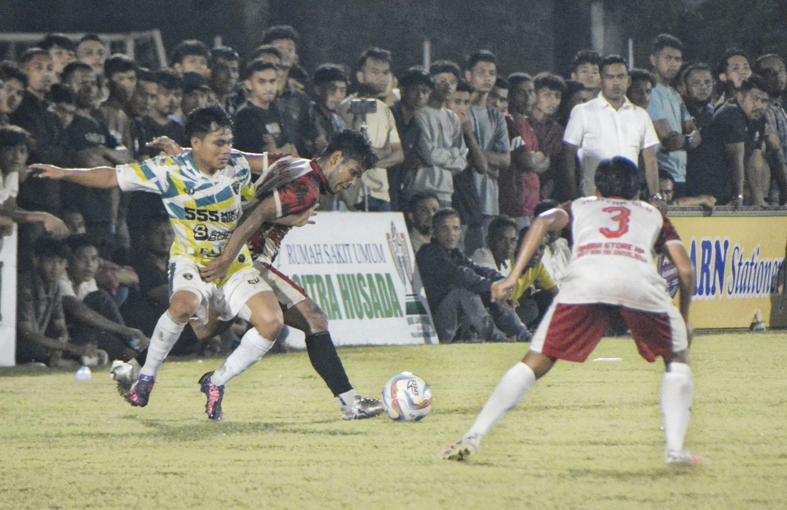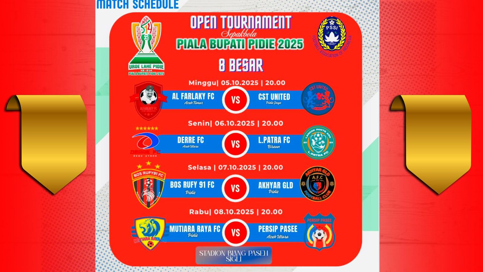 Sigli,haba RAKYAT I Dihadapan ribuan penonton, Bos Rufy 91 FC Lampoh Krueng Sigli (kostum kuning putih), berhasil mengalahkan Akhyar GLD Padang Tiji (kostum putih merah) dengan skor 1-0 dalam pertandingan lanjutan babak 8 besar Piala Bupati Hari Jadi (Hajad) ke-514 Pidie yang berlangsung di Stadion Blang Paseh Sigli, Selasa (07/10/2025) malam.