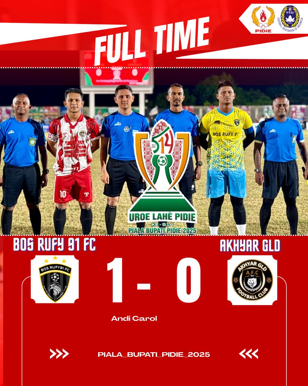 Gol tunggal kemenangan Bos Rufy 91 FC, tim asal kampungnya Keuchik Ala, dicetak oleh Andi Caroll pada menit ke-52 melalui sundulan yang tak mampu diantisipasi oleh penjaga gawang Akhyar GLD Padang Tiji.