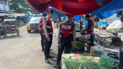 Personel Sat Samapta Polres Lhokseumawe, saat melaksanakan patroli rutin di sejumlah pasar tradisional, dengan fokus mencegah aksi premanisme dan praktik pungutan liar (pungli) yang kerap meresahkan pedagang maupun pengunjung. Foto : Yoes/haba RAKYAT.