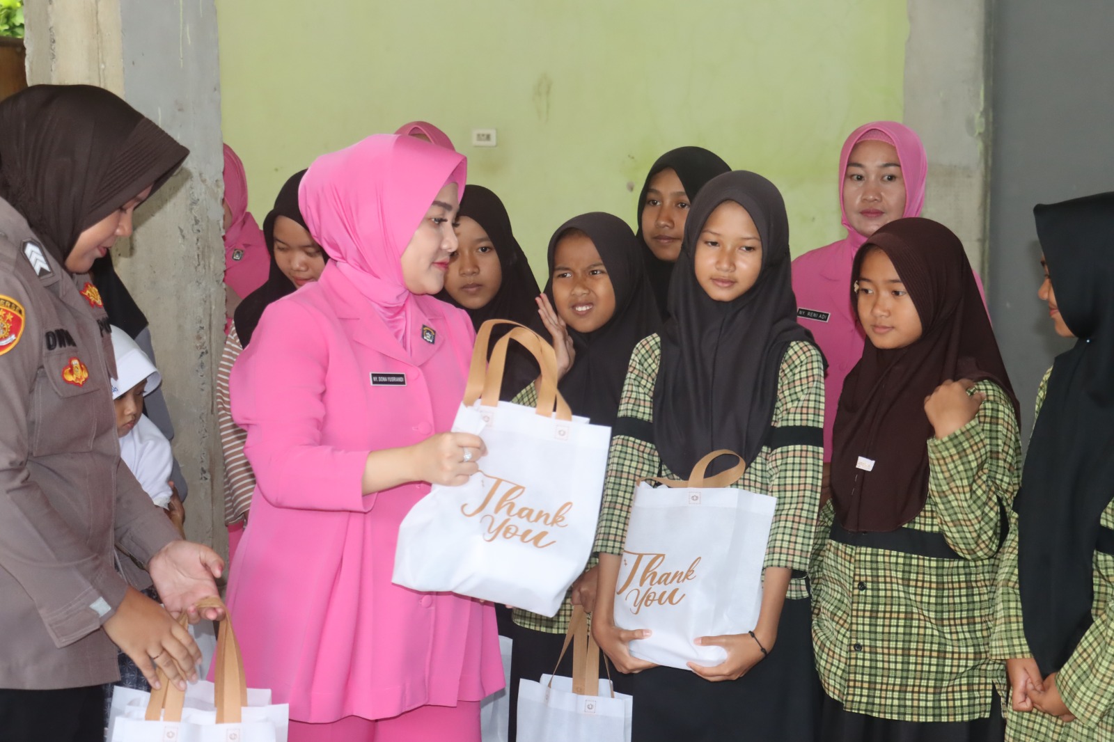 Polres Lampung Selatan bersama Bhayangkari Cabang Lampung Selatan menggelar aksi sosial dengan membagikan takjil gratis kepada para santri di Pondok Pesantren Miftahul Huda 1040, Desa Hatta, Kecamatan Bakauheni. Kamis (6/3/2025). Foto : Falahhudin/haba RAKYAT.