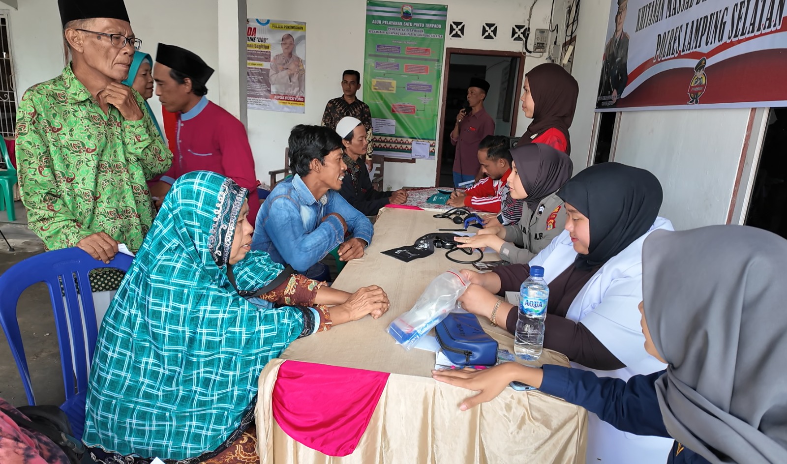 Polres Lampung Selatan menggelar kegiatan Bakti Sosial, Bakti Kesehatan Sunatan Massal, serta pemeriksaan kesehatan bagi warga lanjut usia (lansia) di Balai Desa Ruguk, Kecamatan Ketapang. Foto : Beddi Rizal/haba RAKYAT.