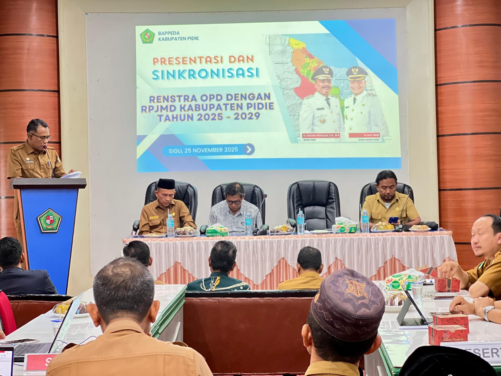Sigli,haba RAKYAT I Sekda Drs. Samsul Azhar, yang mewakili Bupati Pidie, dan didampingi oleh Asisten II, Apriadi Ahmad, S.Sos., Kepala Bappeda, H. Isnaini Ibrahim, S.T., M.Si., serta Tenaga Ahli RPJMD, Umar Mahdi, S.H., M.H., membuka kegiatan Presentasi dan Sinkronisasi Rencana Strategis (Renstra) Organisasi Perangkat Daerah (OPD) dengan Rencana Pembangunan Jangka Menengah Daerah (RPJMD) Kabupaten Pidie Tahun 2025-2029, di Aula Bappeda setempat, Selasa (25/11/2025).