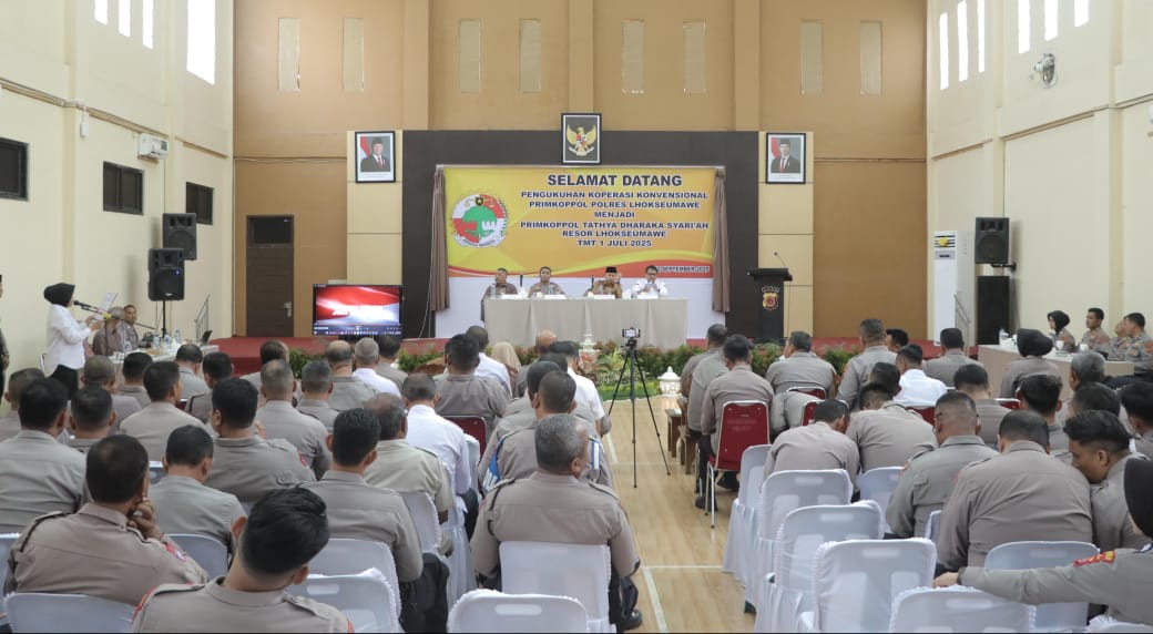LHOKSEUMAWE – haba RAKYAT | Primkopol Polres Lhokseumawe resmi dikukuhkan menjadi Primkopol Tahtya Dharaka Syari’ah, Senin pagi (22/09/2025). Pengukuhan berlangsung di Mapolres Lhokseumawe dengan dihadiri Kapolres AKBP Dr. Ahzan, S.H., S.I.K., M.S.M., M.H, Kepala Dinas Perindustrian, Perdagangan, Koperasi dan UKM (Disperindagkop) Kota Lhokseumawe Muhammad Rizal, Ketua Primkopol AKP (Purn) Abdul Latif, jajaran pembina dan pengawas koperasi, serta anggota koperasi yang terdiri dari pejabat utama dan personel Polres Lhokseumawe.