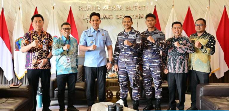 Bupati Lampung Selatan, Radityo Egi Pratama, menerima audiensi Pusat Hidrografi dan Oseanografi TNI Angkatan Laut (Pushidrosal) di ruang kerjanya. Foto : Wiji Lastini/haba RAKYAT.