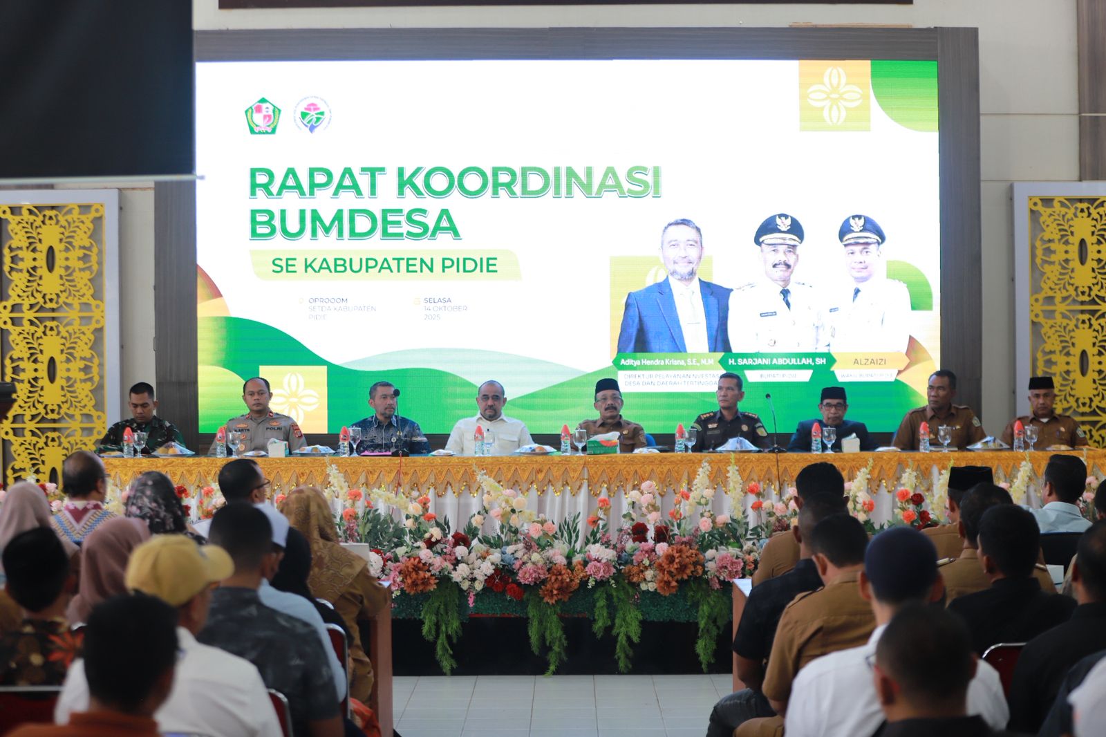 Bupati Pidie H. Sarjani Abdullah, S.H., M.H., didampingi Sekda, Drs. Samsul Azhar, dan Kepala Dinas Pemberdayaan Masyarakat dan Gampong (DPMG), Wahidin, S.STP., M.Si., secara resmi membuka Rapat Koordinasi (Rakor) Badan Usaha Milik Desa (BUMDes) Kabupaten Pidie Tahun 2025 di Oproom Setdakab setempat, Selasa (14/10/2025).