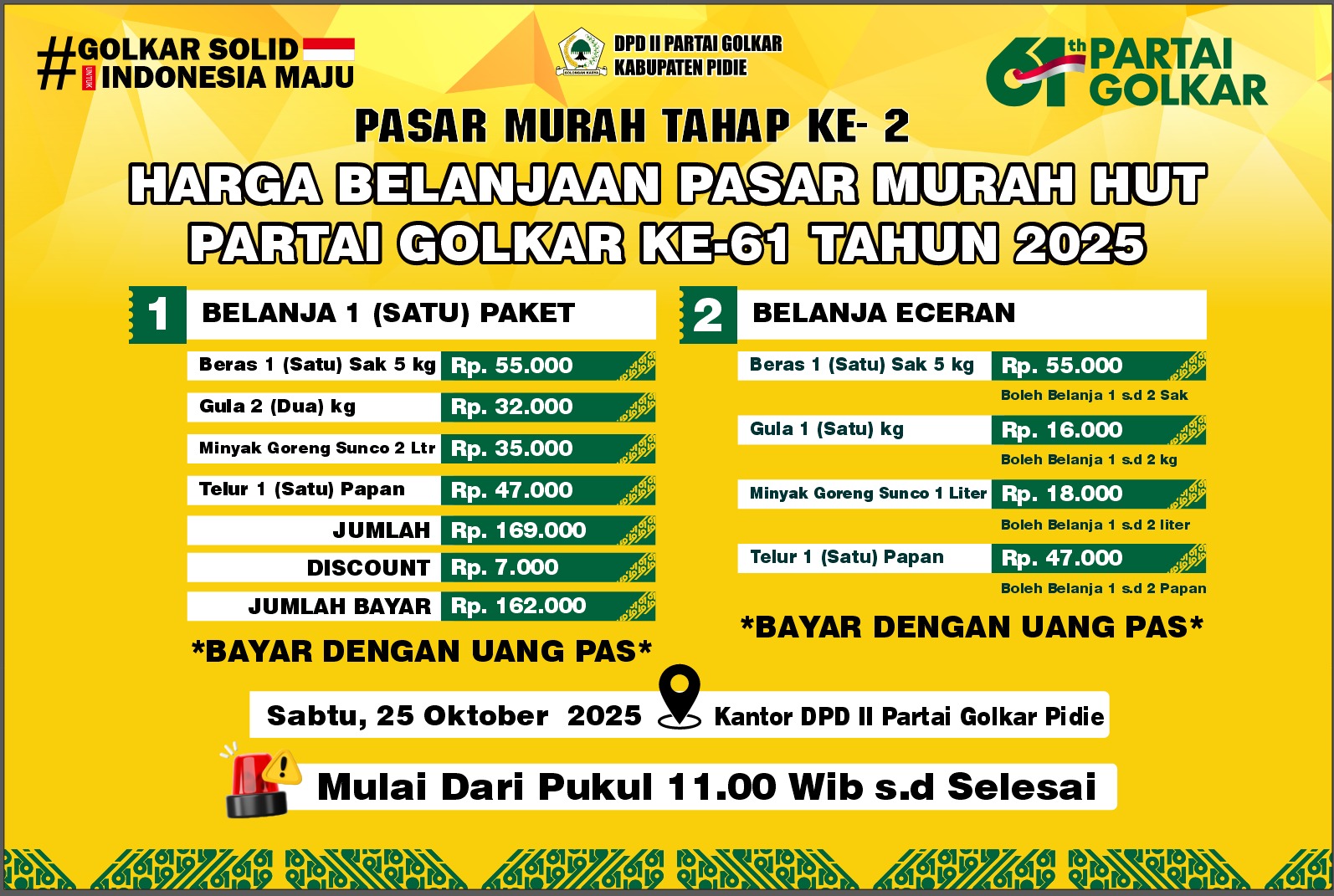 Rangkaian HUT ke-61 pada 25 Oktober 2025 ini, juga diadakan Pasar Murah Gelombang II yang digelar di halaman Sekretariat Partai. Pasar murah ini menawarkan berbagai produk kebutuhan pokok dengan harga yang sangat terjangkau, yang dimanfaatkan oleh warga untuk berbelanja dalam memenuhi kebutuhan sehari- hari.