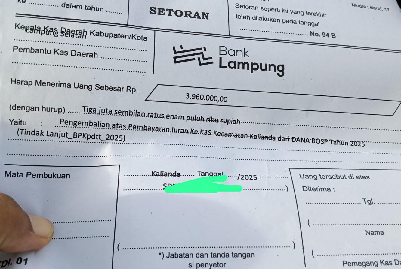 Dimana kepala sekolah melakukan pengembalian atas iuaran ke K3S kecamatan Kalianda dari Dana BOSP Tahun 2025 (tindak lanjut BPKpdtt 2025) sebesar Rp. 3.960.000 yang ditujukan kepada Kepala Kas Daerah Kabupaten Lampung Selatan.