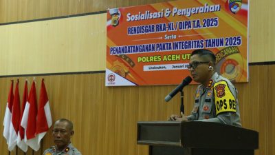 ACEH UTARA – haba RAKYAT | Kapolres Aceh Utara, AKBP Nanang Indra Bakti, S.H., S.I.K memimpin sosialisasi Daftar Isian Pelaksanaan Anggaran (DIPA) tahun 2025. Digelar pula penandatanganan Pakta Integritas Polres Aceh Utara dengan Polsek jajaran, Senin (13/01/2025).
