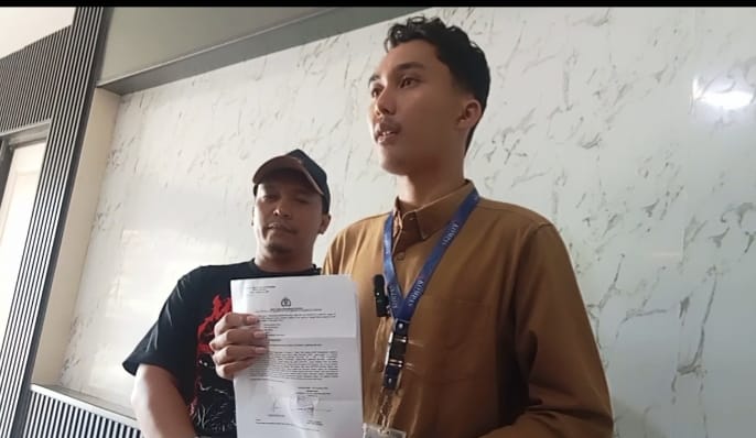 Wartawan Kompas TV, Tengku Khalidsyah, saat melaporkan sekelompok oknum preman ke Polres Lampung Selatan, yang diduga mengalami intimidasi saat melakukan peliputan dugaan pemalakan terhadap warga Desa Legundi, Kecamatan Ketapang. Foto : Wiji Lastini/haba RAKYAT.